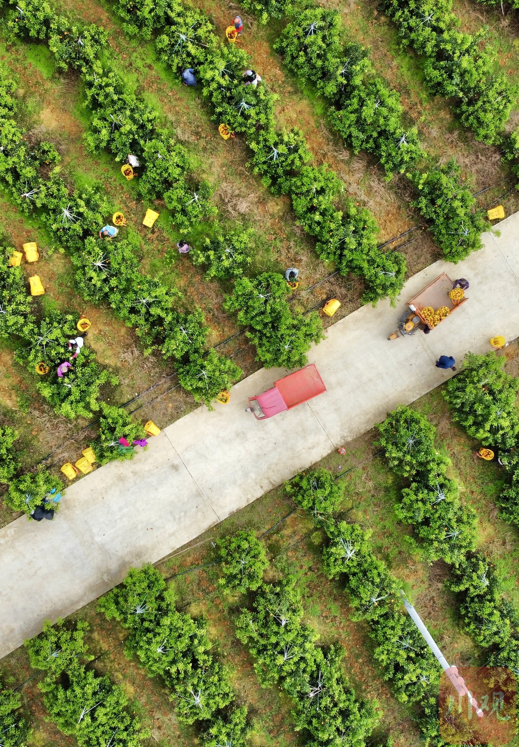 一排三轮车等在一旁,待装满一车斗后,便迅速驶往柑橘产业加工园区。在那里,新鲜采摘下来的柑橘经历筛果、装框、打包等一系列流程,快速发往全国各地。