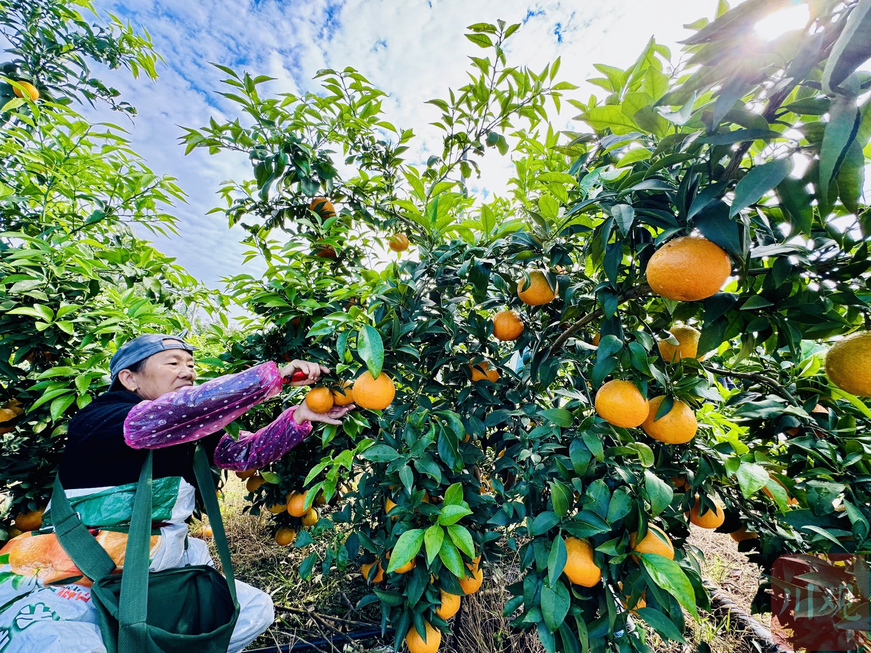 万亩果园里,一株株错落有致的柑橘树被金黄果实压弯了腰,空气中,橘香味肆意沁人心脾,惹人垂涎。果农们手持剪刀穿梭于橘树间,将一颗颗黄澄澄的果子从树上剪下放入背篓中。
