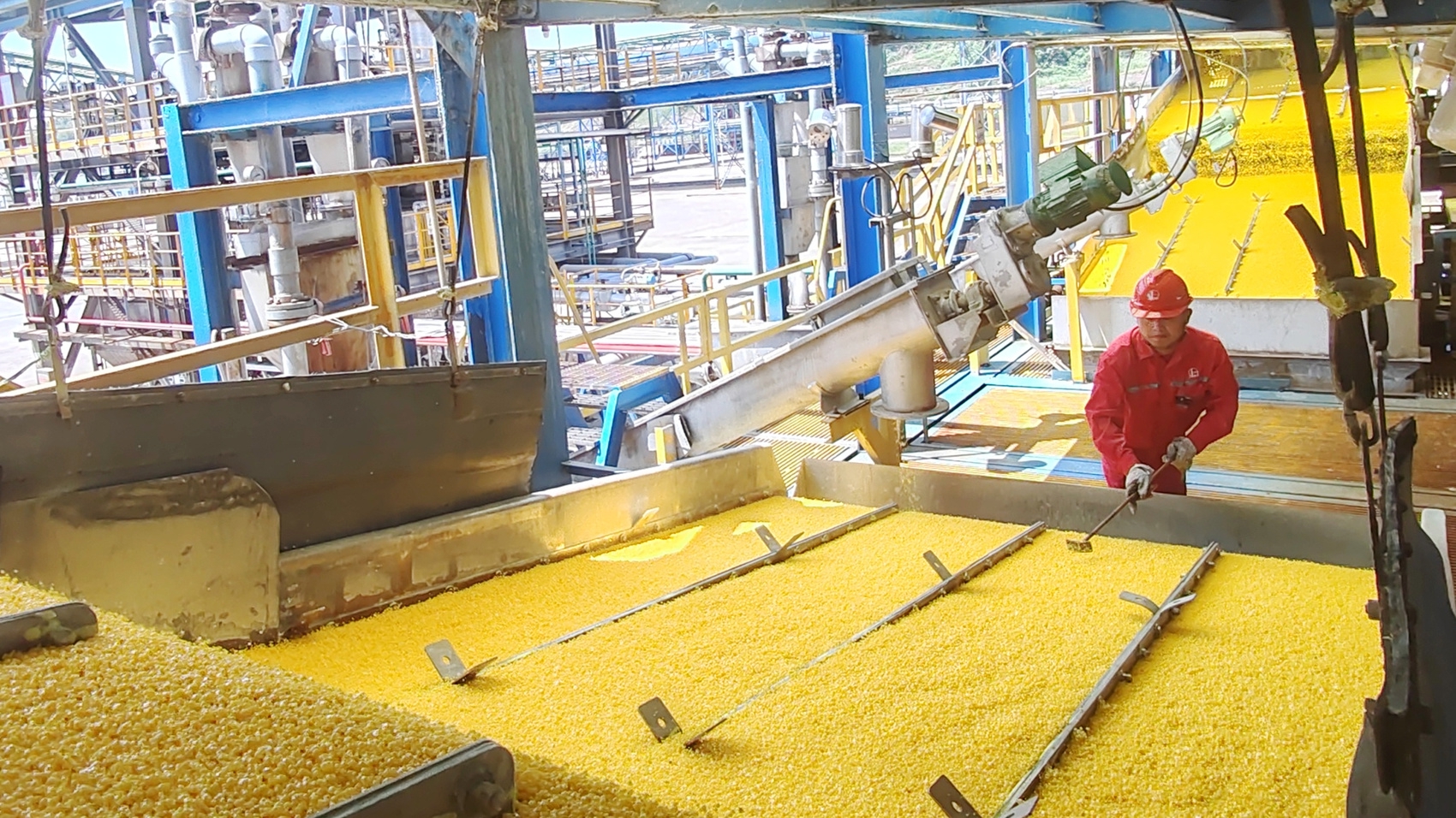 岁末年初,是农资化肥生产企业备足原料,保障春耕的关键期。12月10日,中国石化中原油田普光分公司天然气净化厂储运车间外,数十辆大卡车排成长龙等着拉运硫黄。金灿灿的硫黄“豆子”汇成“瀑布”,从装车楼下料溜管里飞流直下,在车厢里落成一座座“金山”。