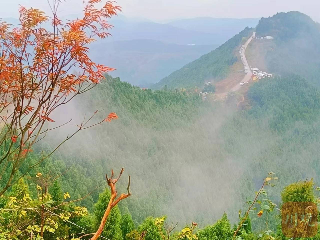 从鹤鸣山半山徒步而上,仿若踏入一幅诗意的水墨画银杏叶如点点碎金,洒落一地,爬到山顶连绵起伏的山峦,层林尽染,红叶似火。