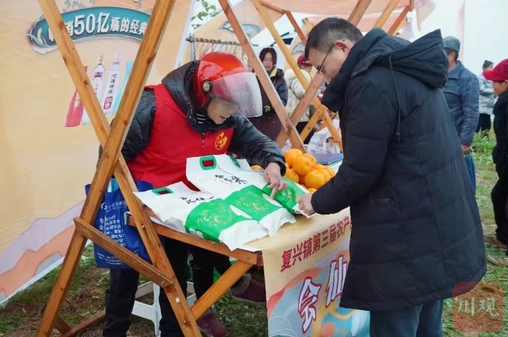 除了赏红叶,复兴镇还将文旅、农旅进行深度融合。在三江村,村道路两边摆满了各种农户产品,前来摆摊的都是三江村和周边村的农户们,他们向游客展示着复兴镇的特色农产品,潼射粉条、安乐皇牛、红桂奇蛋、天仙山羊……提升了当地特色农产品的知名度,也扩宽了产品的销路。