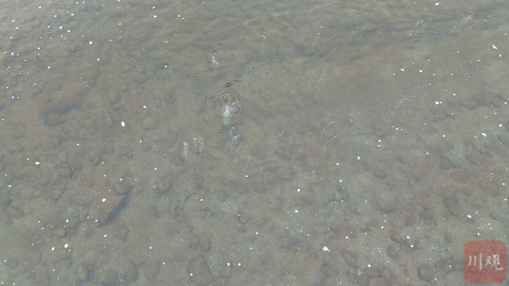 12月12日中午,川观新闻记者来到现场看到,州河河段一处浅滩外拉起了警戒线,在距离浅滩五六米的河水中,河底有多处孔洞持续冒出气体。其中一个较大的孔洞冒出气体的样子,就像锅中的水烧开了不断沸腾翻滚,周围水面也漂浮着大量气泡。浅滩上还有树木被烧过的痕迹。从该浅滩出发,川观新闻记者沿该河段上下游各走了约500米,暂未看到河边其他位置有类似冒出气体的现象。