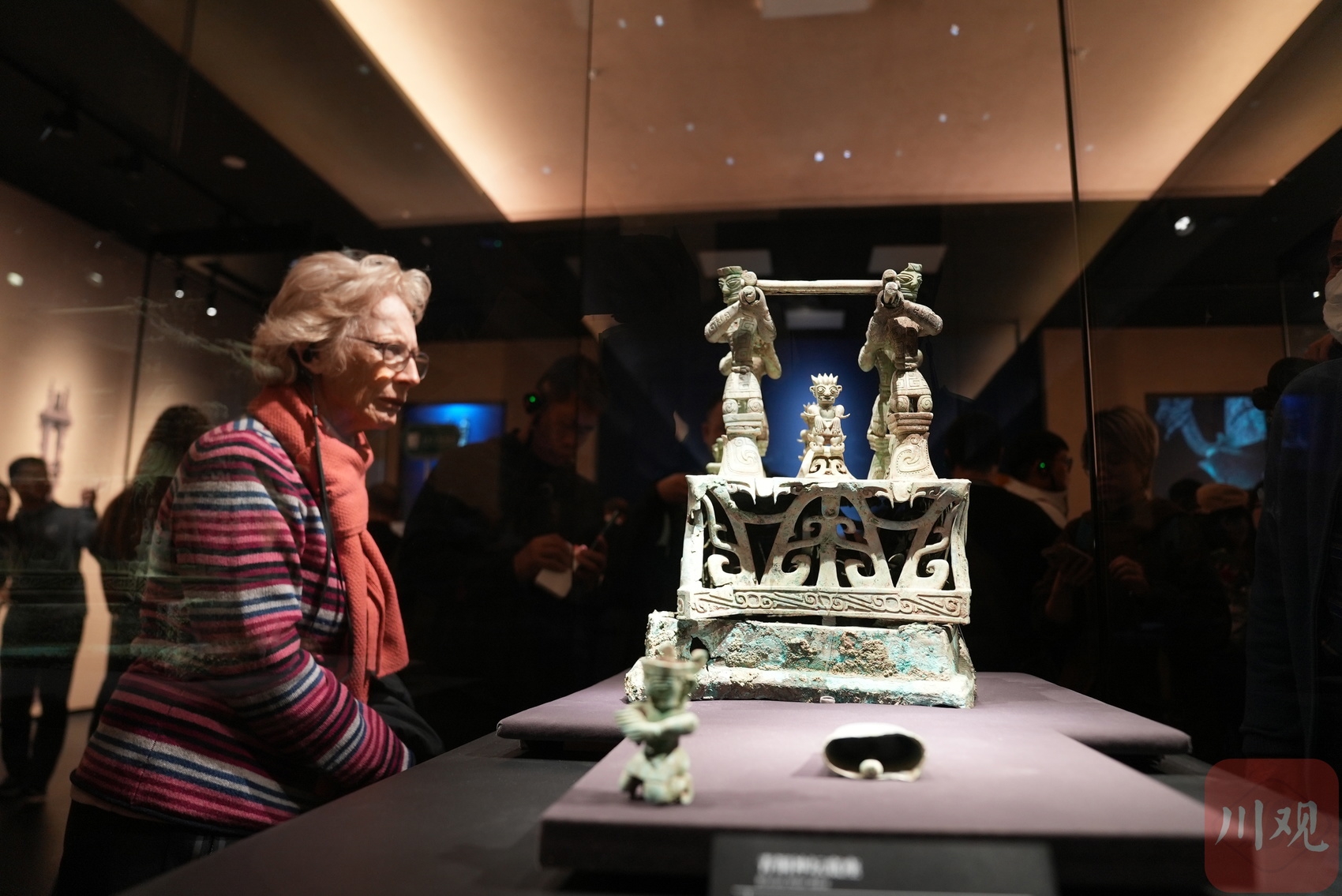 游客参观三星堆出土文物青铜神坛底座。吴枫 摄