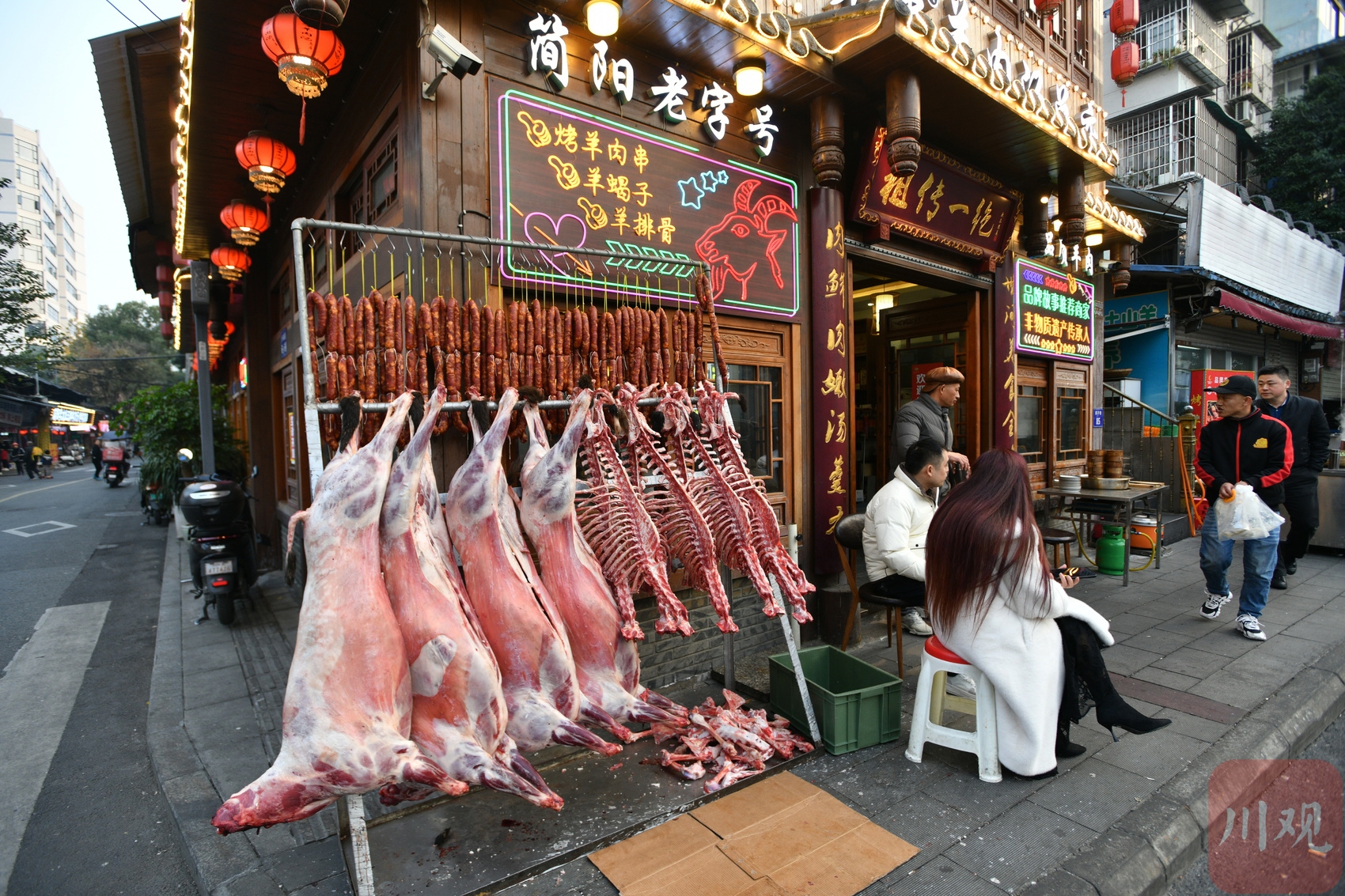 2024年冬至前的成都市小关庙街,各大羊肉汤锅店待客来。