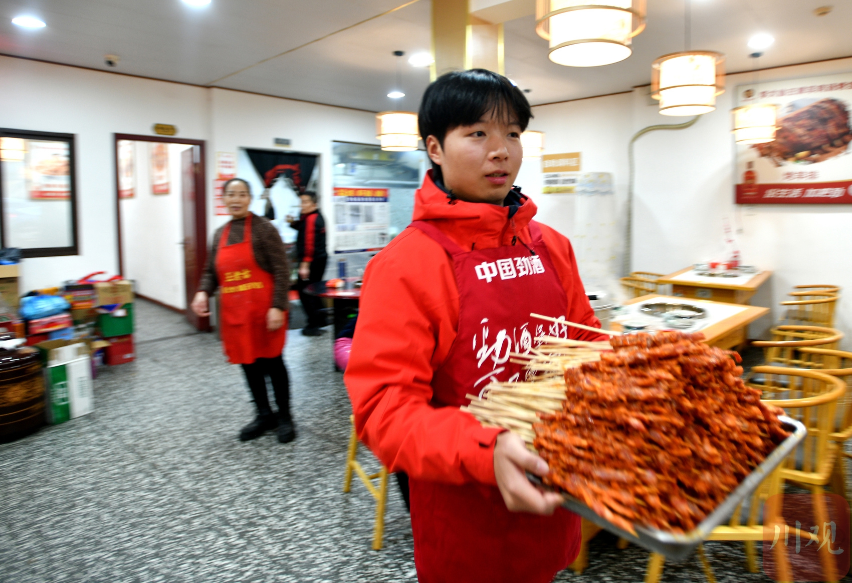 2024年12月17日,挣外快、长见识的20岁小伙严蜀松,穿起围裙在小关庙街的羊肉汤店忙碌。