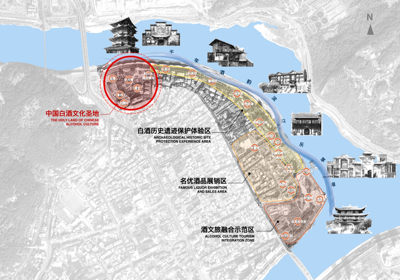 “一带”是指北望真武山,南接冠英古街,“中国酒市”形成了一条2.2公里长的千年酒韵滨江乐享带;“一地”则是宜宾市翠屏区近年来打造的宜宾五粮液501古窖池中国白酒文化圣地,预计明年投用;“三区”包括白酒历史遗迹保护体验区、酒文旅融合示范区、名优酒品展示交易区;由此延伸出中国酒市致力于打造的“三中心”,即世界名酒文化展示中心、中国酒类发布交易中心和国际酒品消费时尚引领中心。