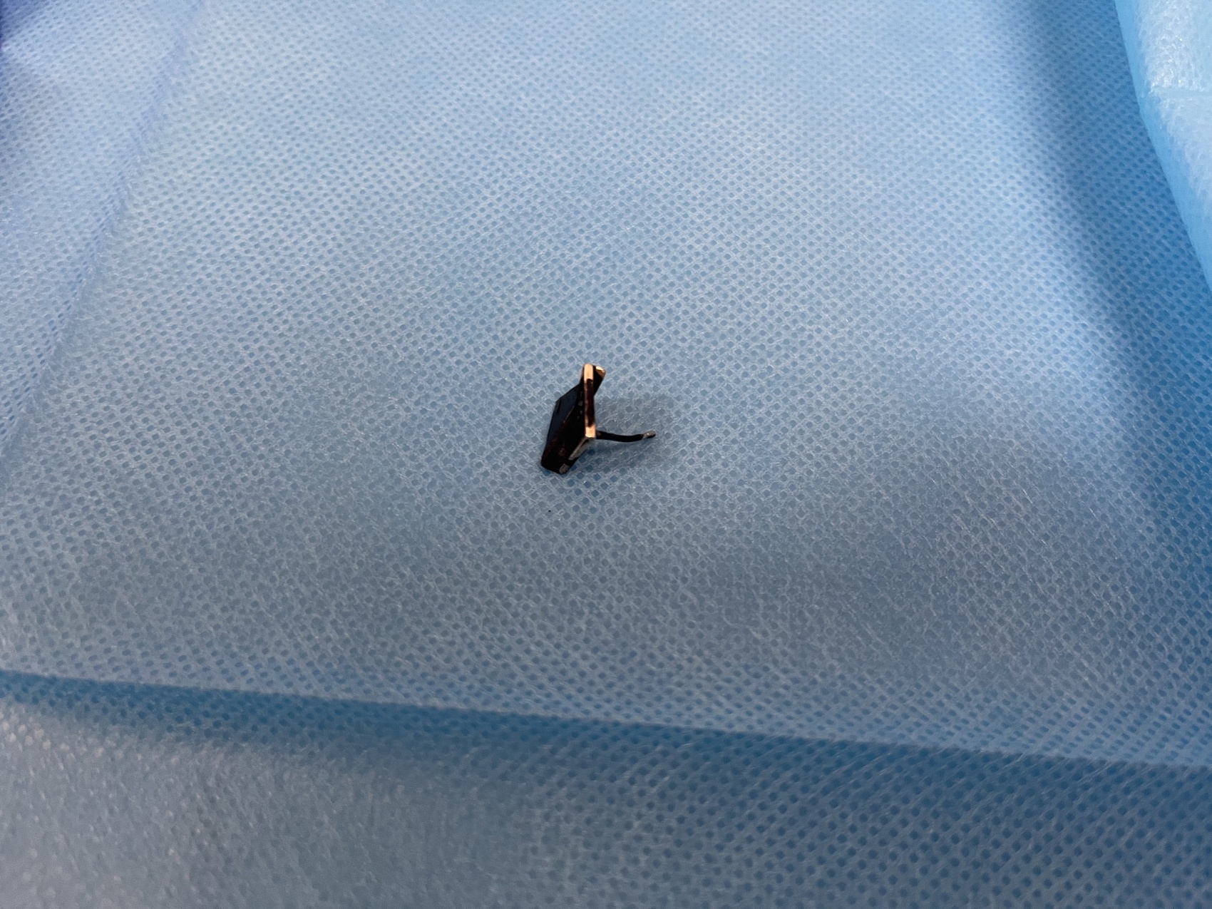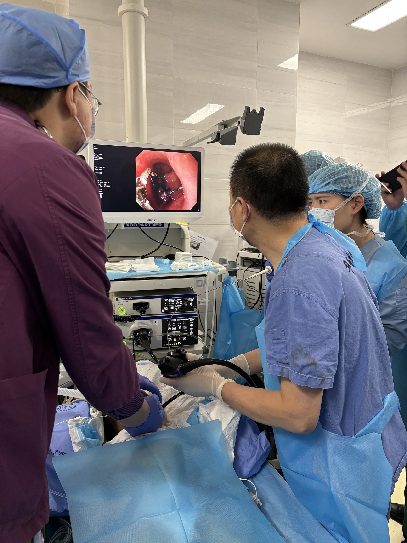 华西医院消化内科胡兵教授、牟一医师,麻醉科胥明哲医师以及小儿外科团队讨论商量后,决定为贝贝进行气管插管全身麻醉下的内镜食管异物取出术。12月17日,手术进行。胡兵教授操作胃镜至贝贝食管入口处发现食管狭窄,管壁有瘢痕样改变,考虑为异物划伤食管壁后所致;换用超细胃镜后通过食管狭窄处,在狭窄下方见一方形金属异物嵌顿,异物外形锋利,尖端已扎入食管壁。