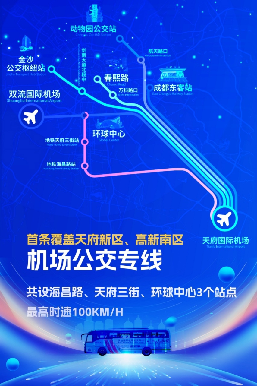 天府国际机场公交专线6号线是成都公交聚焦天府大道及周边区域需求,规划开行的夜间机场专线,运营时间(23:30—次日5:15)与地铁停运时段无缝衔接。该专线从天府国际机场出发,途径天府机场高速、天府机场高速支线、武汉路、天府大道到环球中心,全程62公里,票价25元/人,沿途设置海昌路、天府三街、环球中心3个站点,单程预计行驶时间约80分钟。
