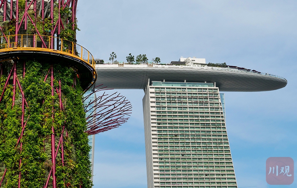新加坡滨海湾的标志性景观 —— 滨海湾花园超级树与滨海湾金沙酒店同框。