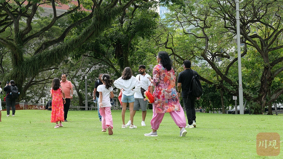 新加坡的公园绿地, 树木枝叶繁茂,绿意盎然 ,人们在草坪上游玩。