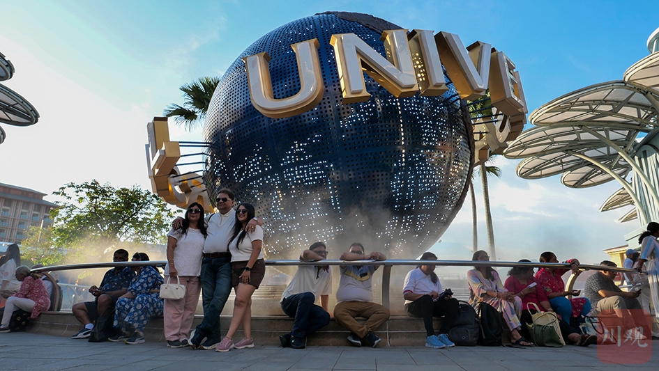 新加坡环球影城标志性景点 “环球影城地球”,地球仪上 “UNIVERSAL” 是其象征,吸引了众多游客打卡拍照。
