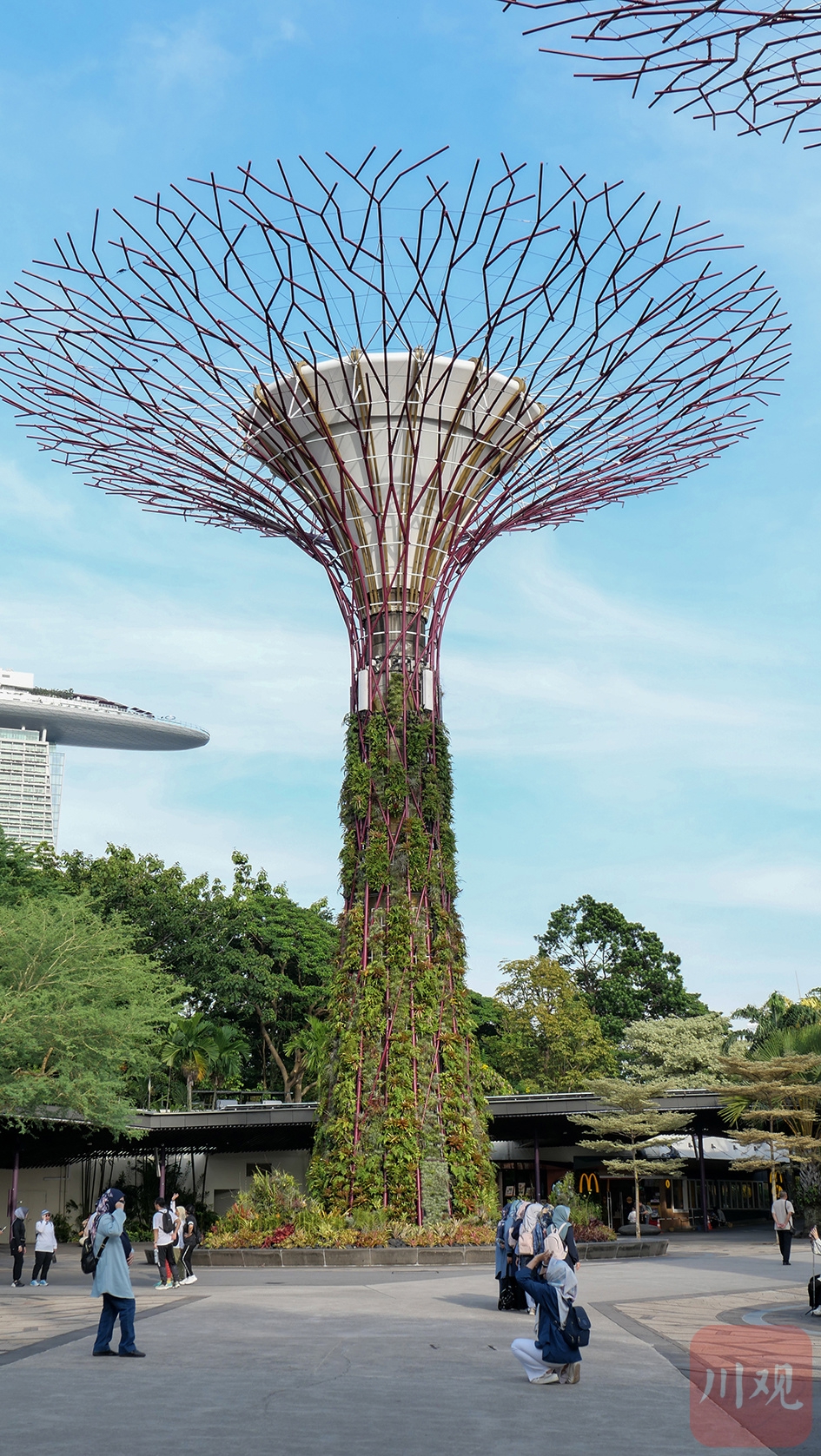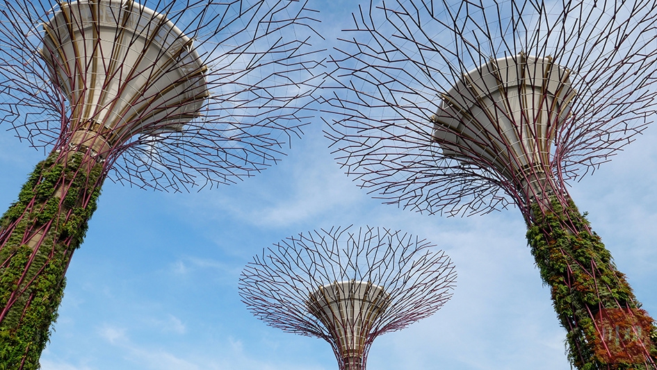 新加坡滨海湾花园标志性景观超级树,树状结构美观,且具收集雨水与太阳能发电功能。