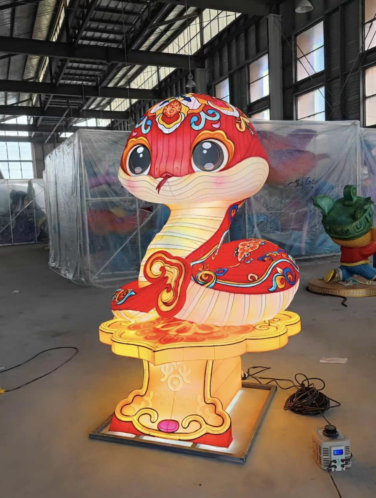 “我们根据3D建模软件进行100%精准放样,采用丝架造型、灯光内透和分色裱糊等传统非遗制灯技艺,向海外友人展现自贡彩灯技艺的精湛。”刚刚从巴拿马城带队完成项目的该公司国际事业部经理唐彬亭告诉记者,蛇尾的如意造型采用浮雕工艺,让尾巴更灵动,灯光装置选用LED柔性灯带,内透光光源更均匀、柔和,更传递出自贡彩灯的节能环保理念,整体制作在兼顾中国传统审美价值的同时,进行了现代化转化。“我们对蛇的嘴部造型进行了Q版处理,让灯组看起来更加乖巧可爱。”唐彬亭说。