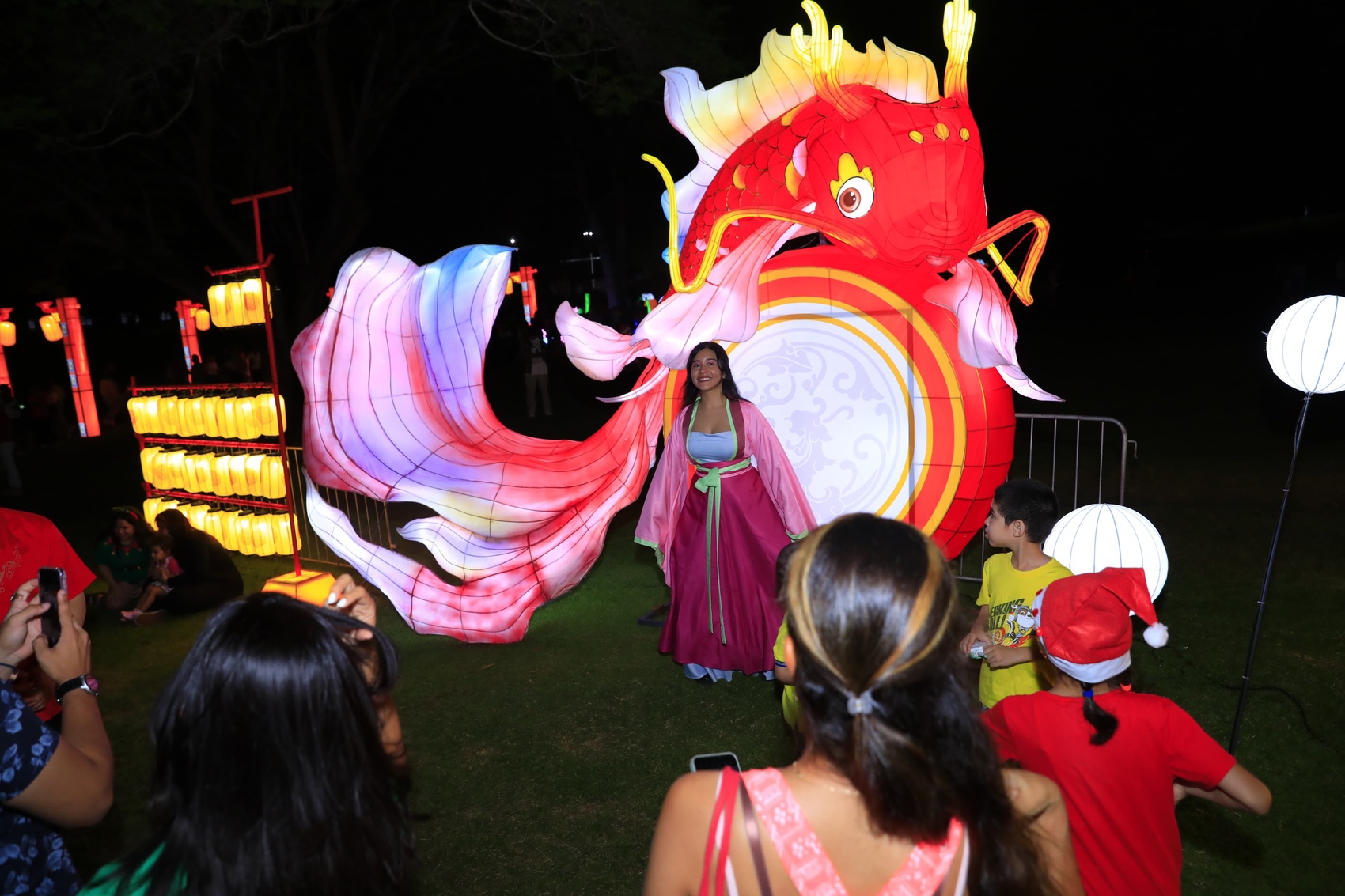 市民穿汉服和灯组合影。