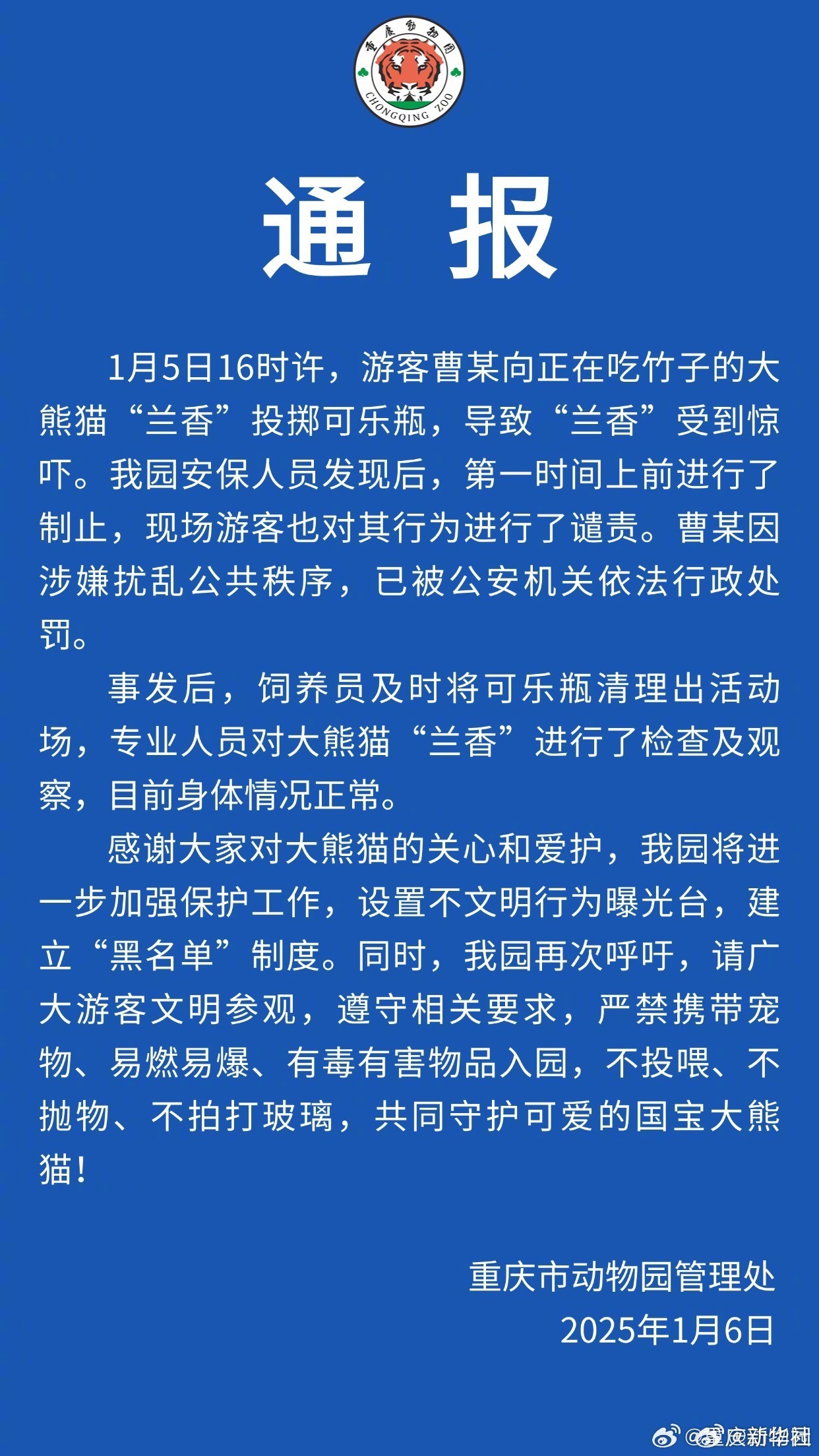 1月6日,重庆市动物园发布通报: