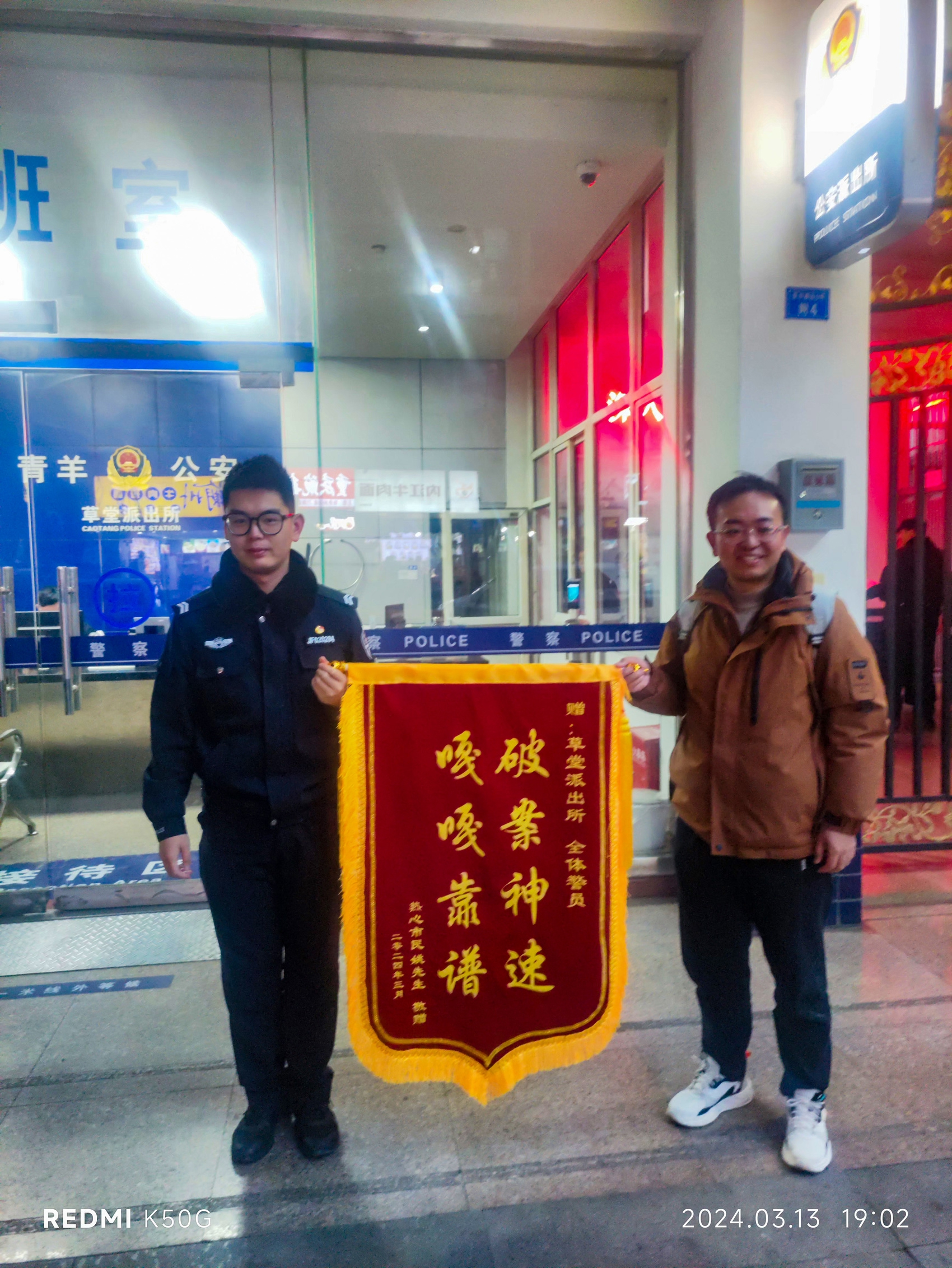 “破案神速,嘎嘎靠谱”,成都市公安局青羊区分局草堂派出所珍藏的这面锦旗让人不禁疑问,有多神速?2024年3月12日晚姚先生报警称自行车被盗,当天值班民警就帮他找回了自行车,“都没到第二天!没想到这么快。”姚先生动作也快,3月13日就送来这面锦旗。