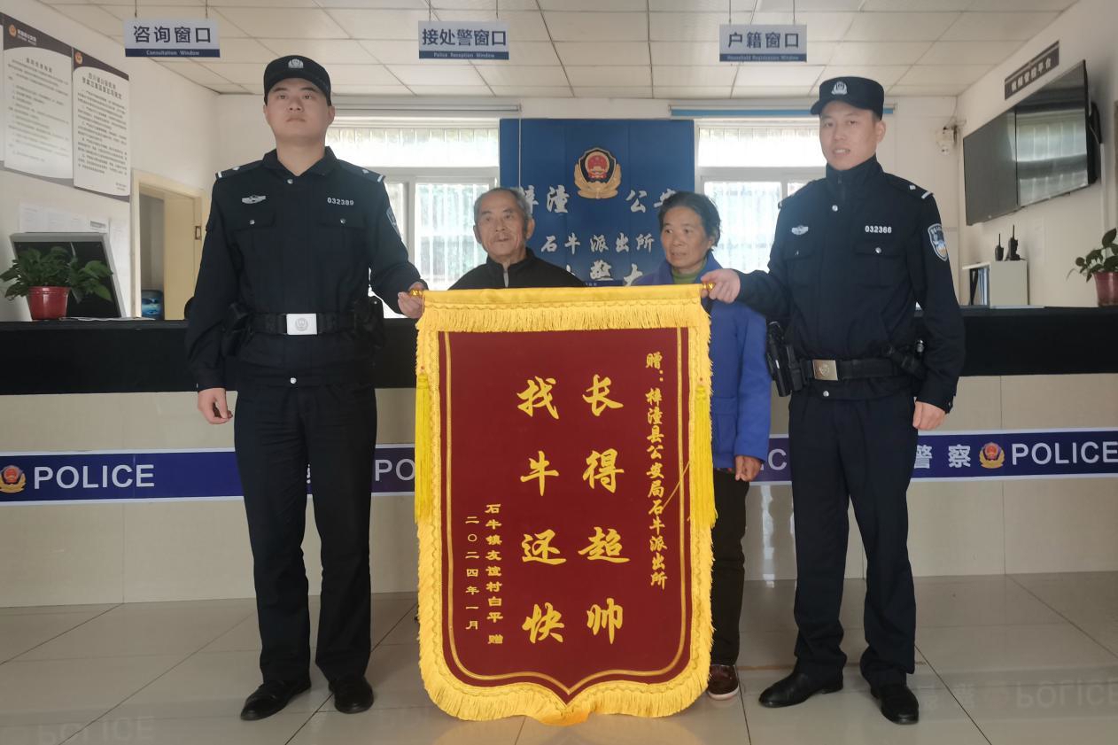 “长得超帅,找牛还快。”绵阳梓潼公安石牛派出所民警4小时极速帮村民找回丢失黄牛,两位老人送来语言质朴的锦旗,肯定了民警的工作和颜值。