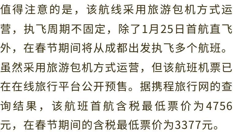 记者了解到,成都天府直飞兰卡威航线由马来西亚飞萤航空采用波音737-800机型执飞,去程航班号FY3891,计划于2时45分从成都天府国际机场起飞,当地时间7时05分抵达兰卡威国际机场,空中飞行时间4小时20分钟;返程航班号FY3890,计划于当地时间21时10分从兰卡威国际机场起飞,次日凌晨1时40分回到成都天府国际机场,空中飞行时间4小时30分钟。