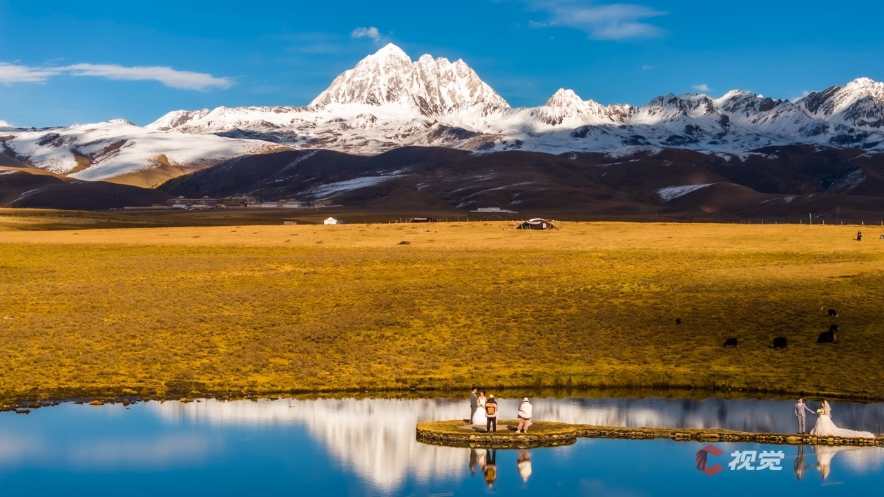 塔公草原是雅拉雪山的最佳拍摄点之一,皑皑的雪山与蓝天,映衬在如明镜的湖水中,仿佛大自然书写的童话,浪漫而唯美。这里也成为了许多新人拍摄婚纱照的选择,在川西版“天空之境”留下“人生照片”。