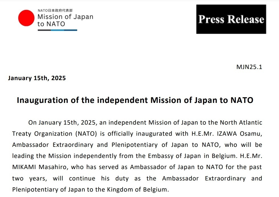 当地时间1月16日,日本政府将原本由日本驻比利时大使馆管辖的北约代表处独立设立,新任专任大使伊泽修于15日向北约秘书长吕特递交国书,正式上任。