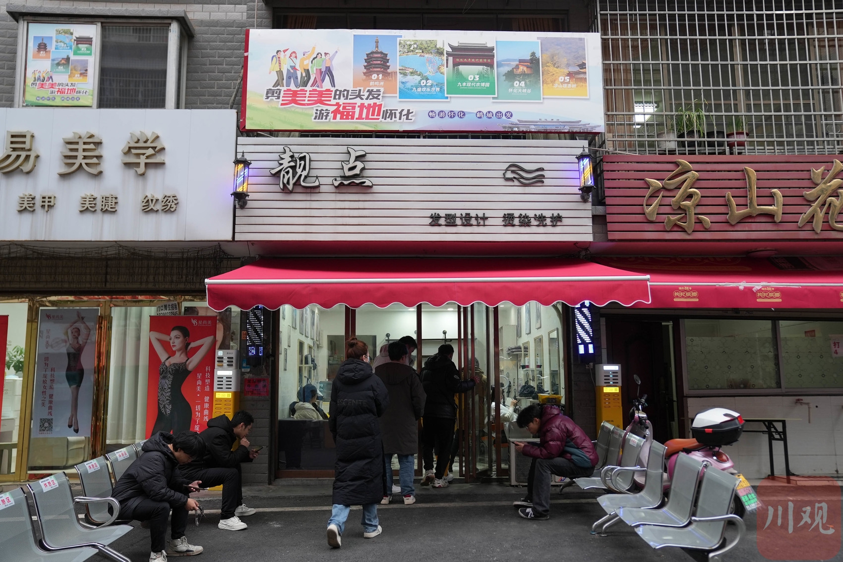 在“靓点理发店”门口摆摊做生意的荆女士介绍,此前她一直在一路之隔的怀化市体育场附近摆摊做零食生意。望着人流量不断向靓点理发店聚集,去年11月上旬,她也搬了过来。“那个月第二个周末下午,就有不少游客拍照了,之后人越来越多。”荆女士形容,“发型师晓华”冲上热搜后的一个多月,靓点理发店门口的人流经常是“乌泱乌泱一大片”,讲着天南地北的话。
