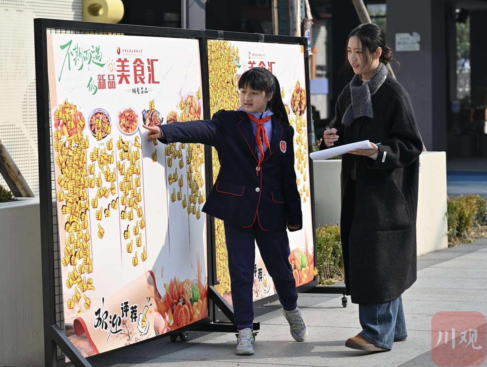 1月14日上午,成都高新区锦城小学锦悦未来广场上,一名学生和后勤服务中心老师查看着“明星菜”票选结果。新菜品酸辣猪蹄将出现在本周五学生的餐桌上。
