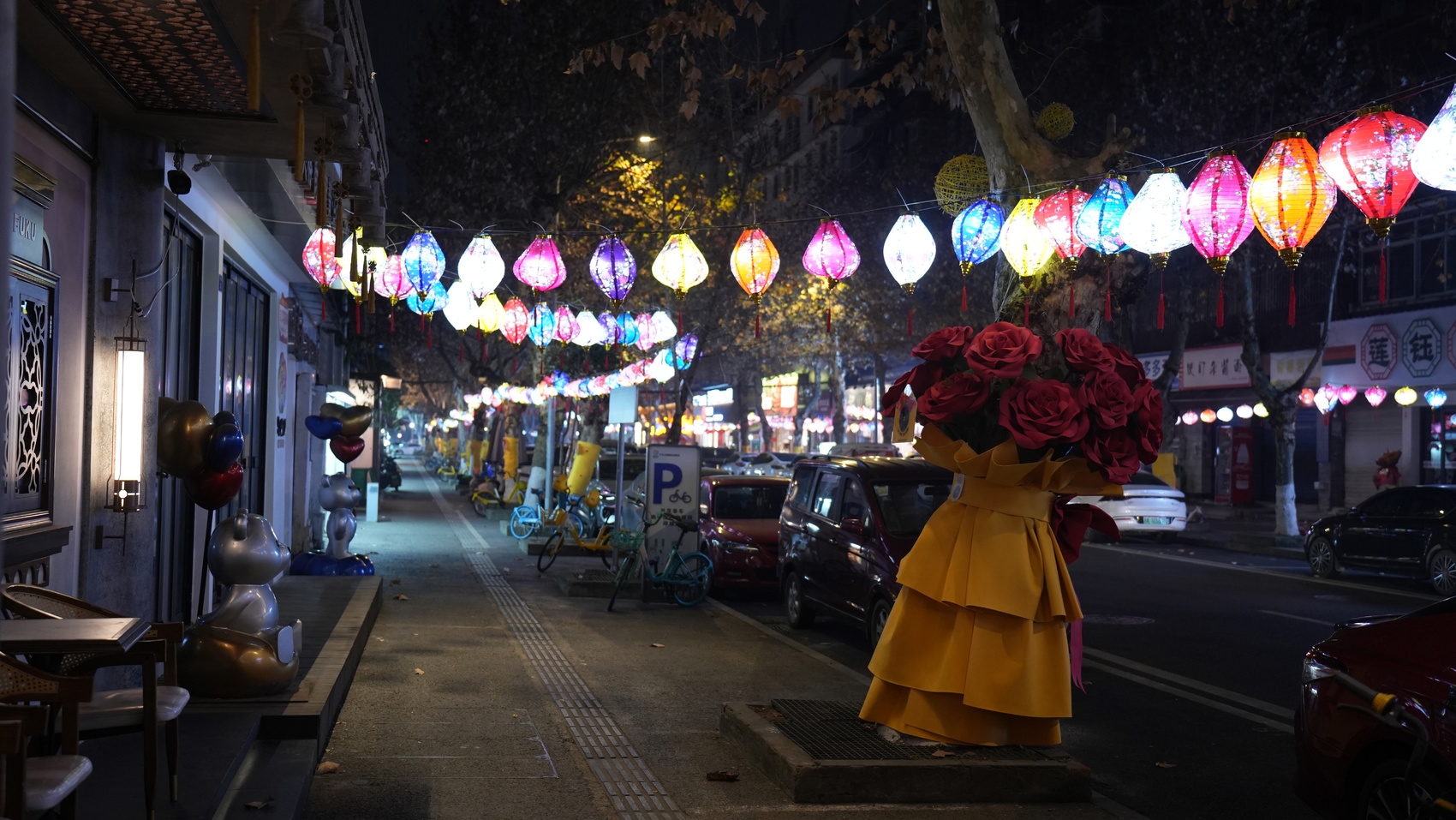 远远看去,灯笼以“Z”字形和“一”字型交错悬挂,随风轻摇。走近细看,每个灯笼表面都绘有锦纹、梅竹、祥云等传统图案,白天衬着冬日暖阳,夜晚映着朦胧灯光,随手一拍,就是一张年味大片。