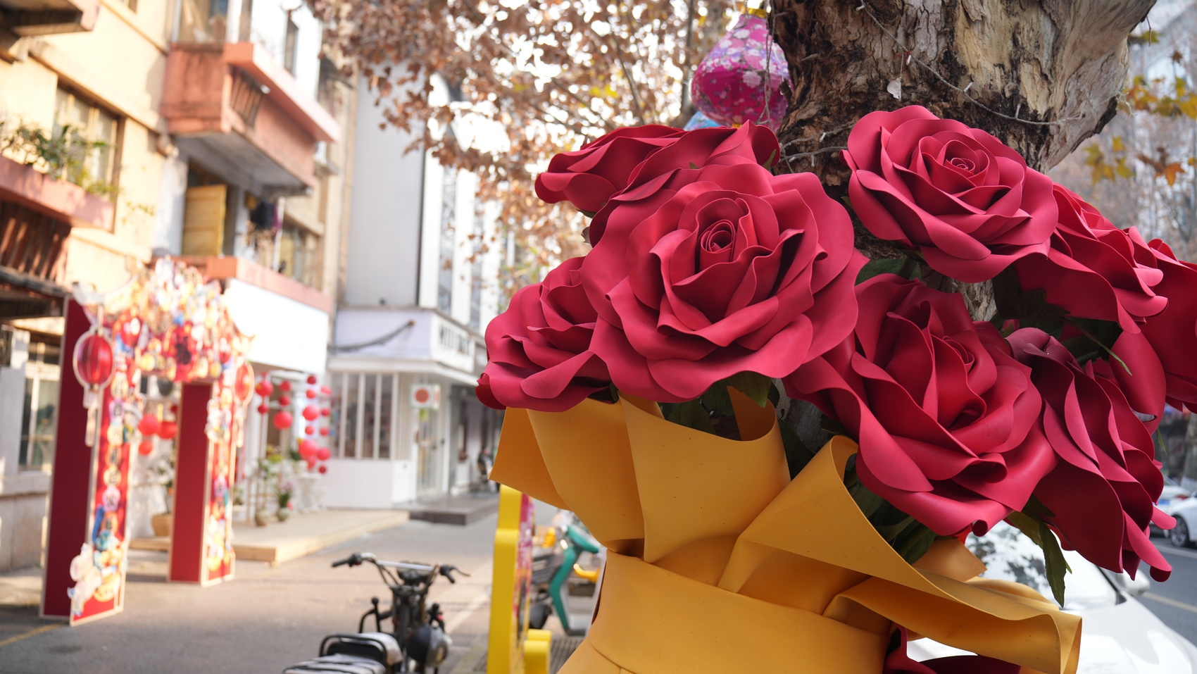 再往前走,路边树上“开”出了一束束巨型玫瑰,明黄色包装纸裹着树干,系上蝴蝶结,衬着艳红花瓣,浪漫氛围满分。不少梧桐树还裹上了手织感的“毛衣”,标语写着“碰面没有目的地,是牛市口就可以”。