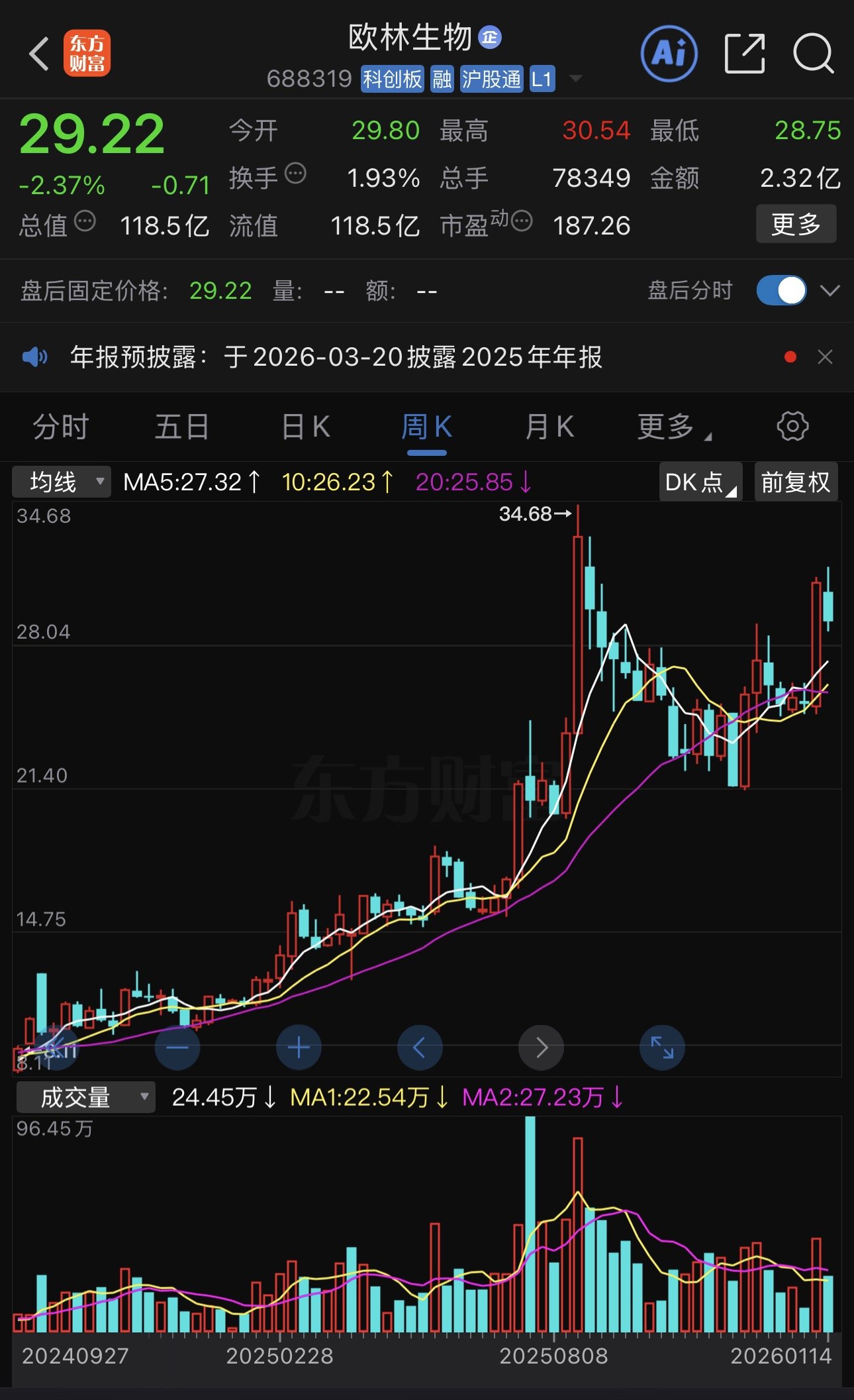 欧林生物周K线图。东方财富截图