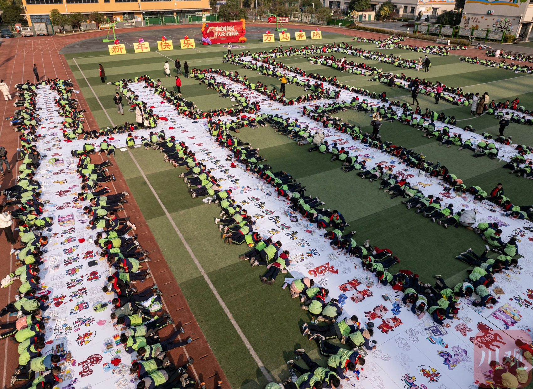 1月14日,自贡市荣县树人小学校的绿茵场上,一幅巨型“马”字图案逐渐清晰——千余名师生以身体为“笔”、色彩为“墨”,在预设的“马”字轮廓中,通过纸绘、陶板绘等多种形式共同创作,最终完成这幅千米长卷上的巨幅骏马图。这是该校专为迎接农历马年打造的“非遗进校园 千人绘马贺新年”特色活动,让传统年俗在校园里焕发新活力。