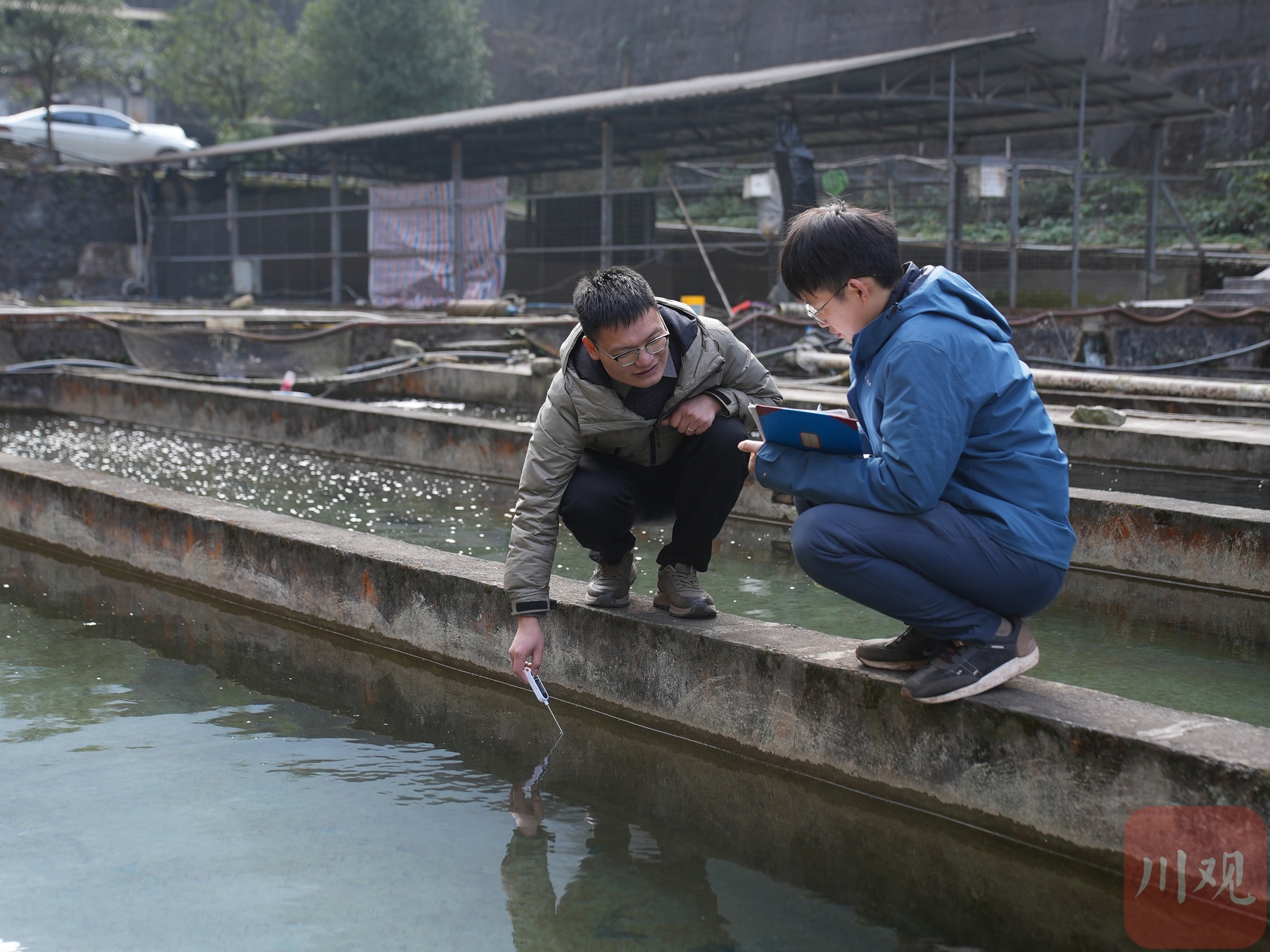 1月9日,杨焕超(左)和同事在测量记录鱼池水温。