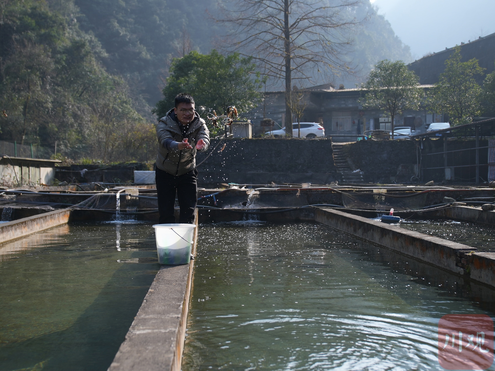 1月9日,杨焕超给川陕哲罗鲑喂食。