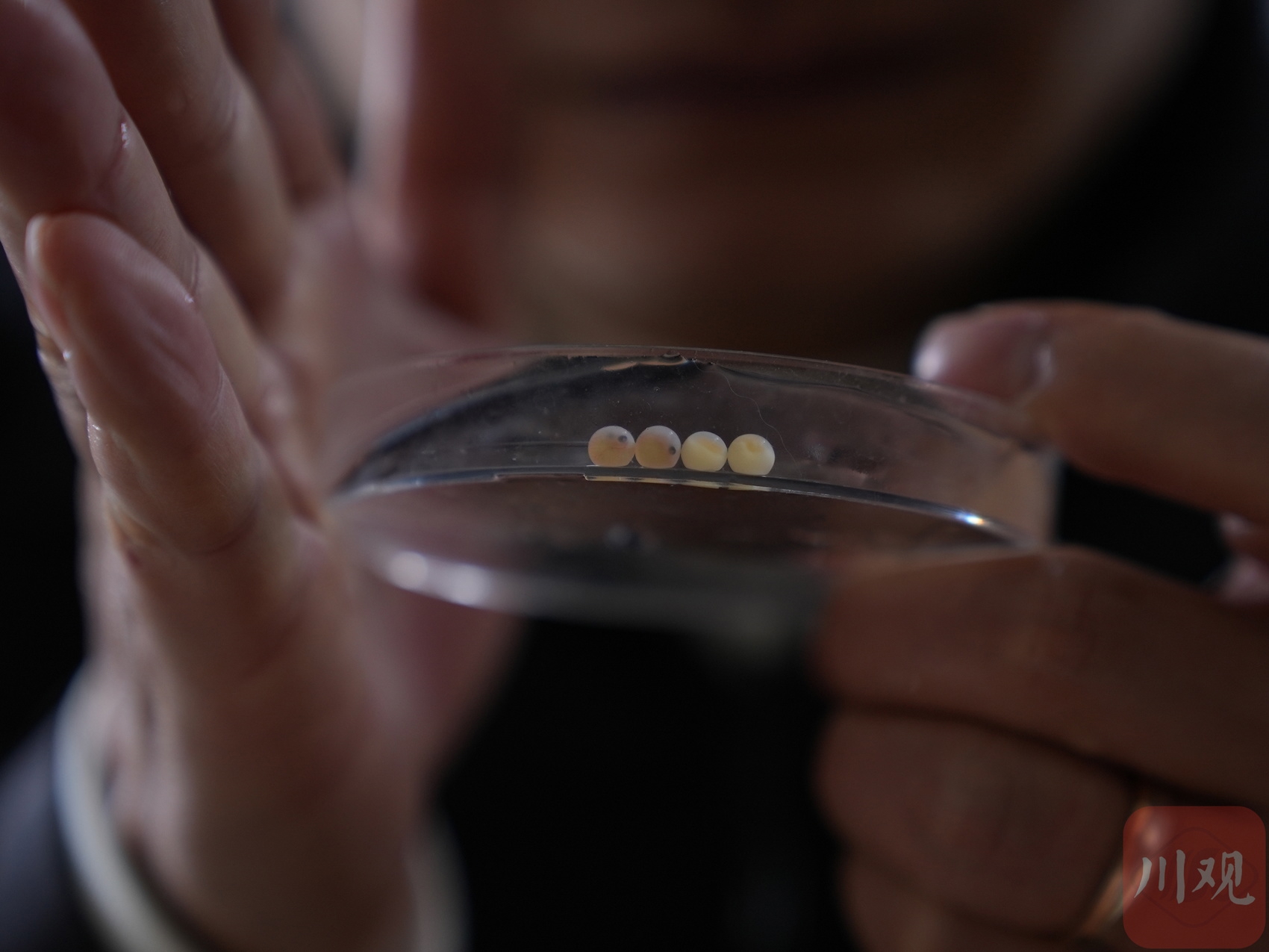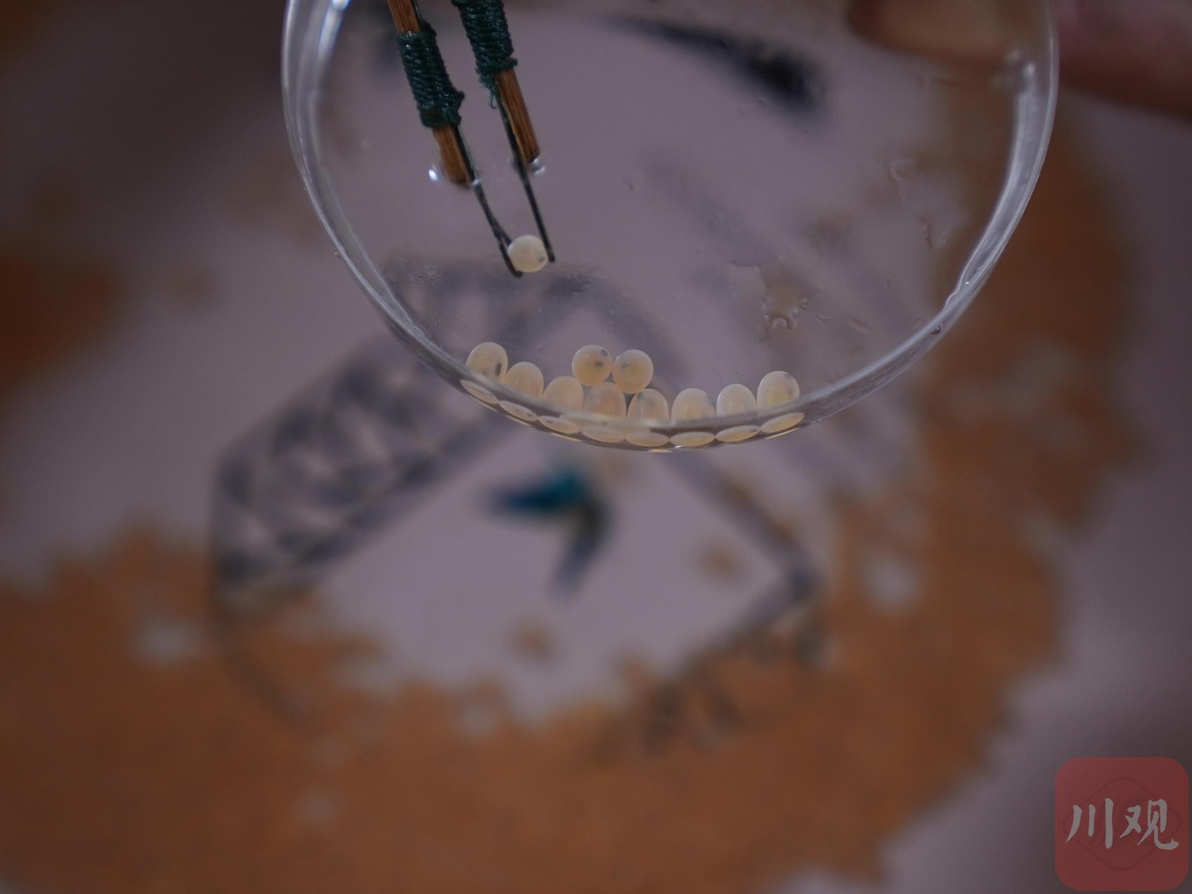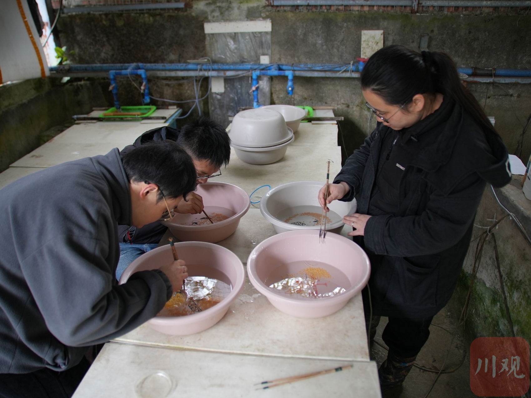 2025年3月29日,工作人员在给川陕哲罗鲑“挑卵”。