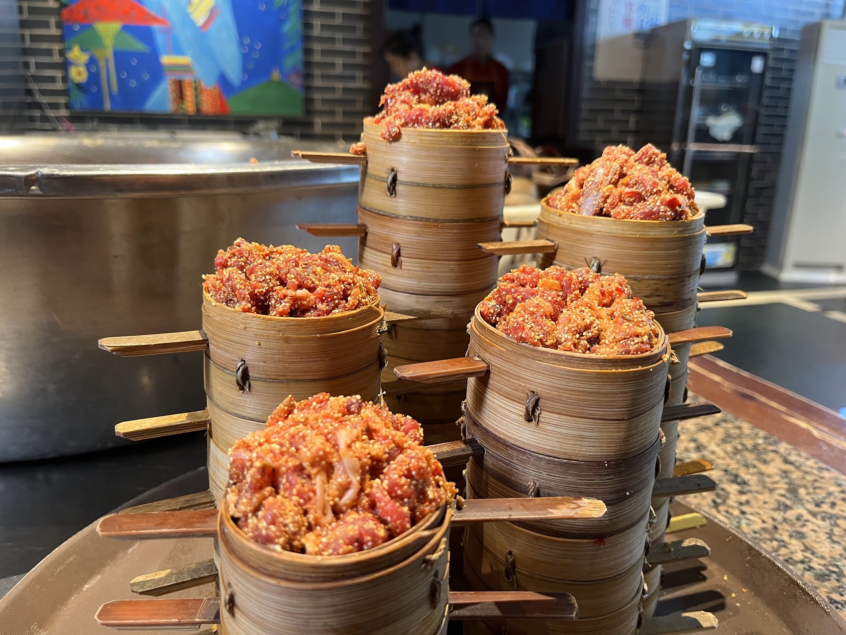 在达州,“格格”可蒸肥肠、排骨等多个品类的美味。在众多“格格”中,羊肉格格稳稳占据人们的“心头宝座”,它精选羊后腿肉中最嫩的部位,搭配秘制香辣调料腌制后蒸制。揭开笼盖的瞬间,蒸汽裹挟着羊肉与香料的复合香气扑面而来。羊肉夹入碗中,佐以花椒、香菜等提味,入口细嫩不柴,回味无穷。