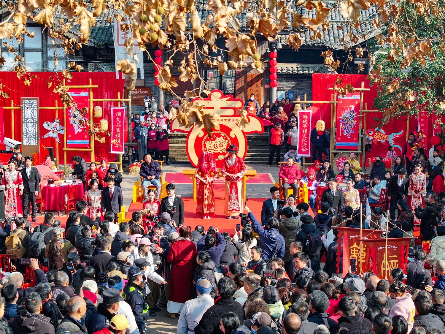 扩大内需,既要“引客进城”,也要“留客在乡”。呆呆家的刨猪宴火了,雨城区在流量中也有自己的思考。1月17日,雅安市雨城区上里古镇“雨城烟火坝坝年”活动火热上演:6对新人完成中式集体婚礼,沉浸式剧目《年猪盛宴·四喜迎春》贯穿接亲、拦门、抢亲等环节;数十桌年猪宴香气四溢,刨猪汤、九大碗让游客与村民围坐共食;非遗市集、春联送福等活动同步展开。