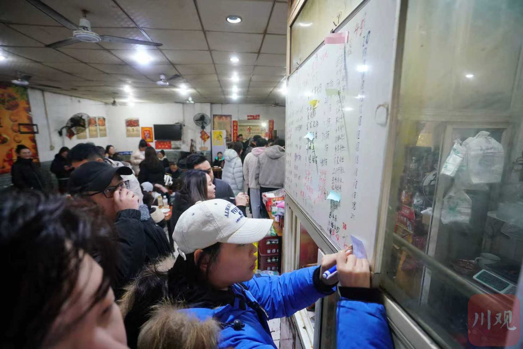 店内没有常规的点餐流程,食客们挤到墙面前,对着手写的白板菜单自己拿笔勾选,卤猪头、爆肥肠、脑花豆腐、火爆腰花是最抢手的招牌菜。开放式灶台前,厨师颠勺时窜起的火焰裹着肉香直钻鼻腔,食客们围在灶台边,眼睛紧紧盯着锅里的动静,手里攥着点菜单,刚出锅的菜几乎被一抢而空。小方桌上,密密麻麻的点菜单铺了一层,周围全是踮脚等菜的人。