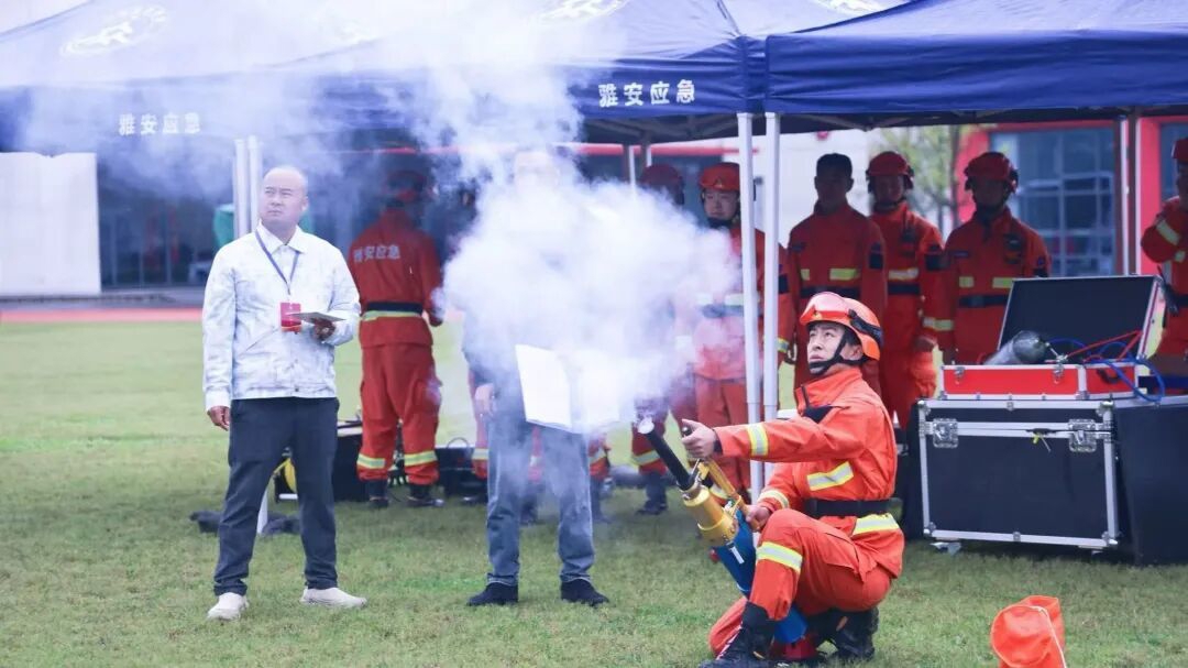 基层应急救援队伍展示救援装备。